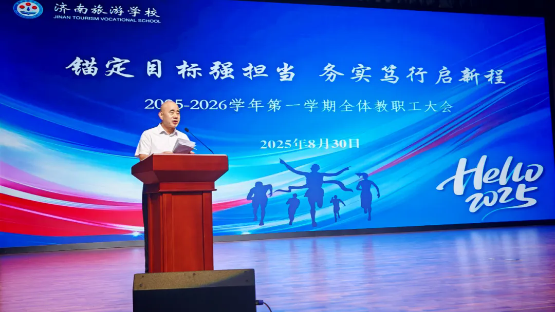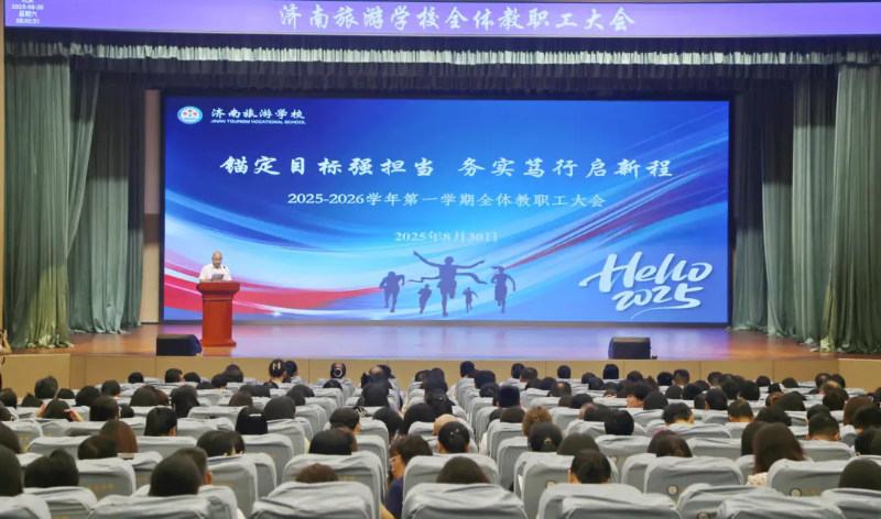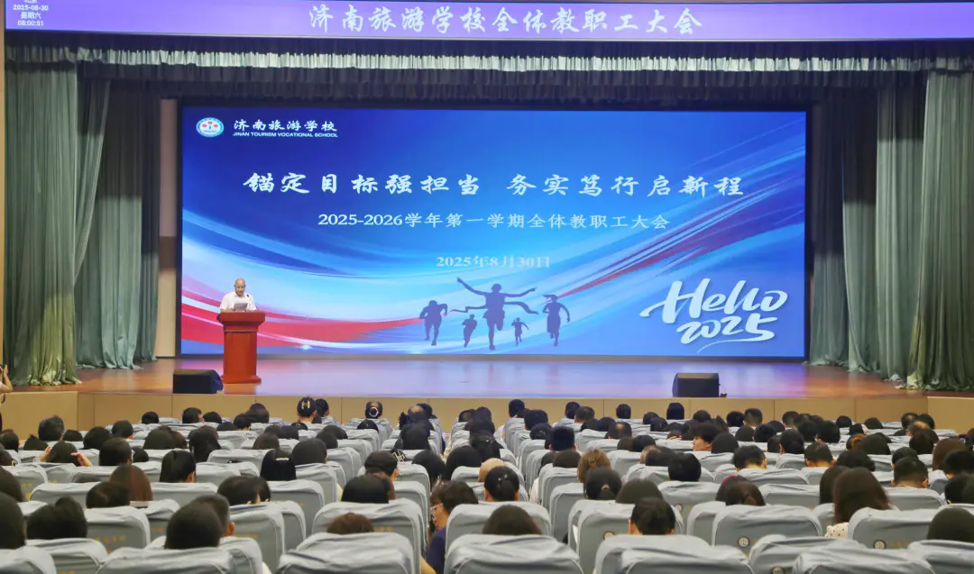 新学期孕育新希望,新起点召唤新作为。为统一思想、凝聚共识,科学谋划新学期发展路径,统筹推进学校内涵建设与品质提升,保障开学前后各项工作紧密衔接、规范运行、提质增效,动员全体教职员工以昂扬的姿态、务实的作风投身教育教学新征程,8月30日,济南旅游学校在尽美报告厅召开2025年秋季学期全体教职工大会,主题为《锚定目标强担当,务实笃行启新程》。
