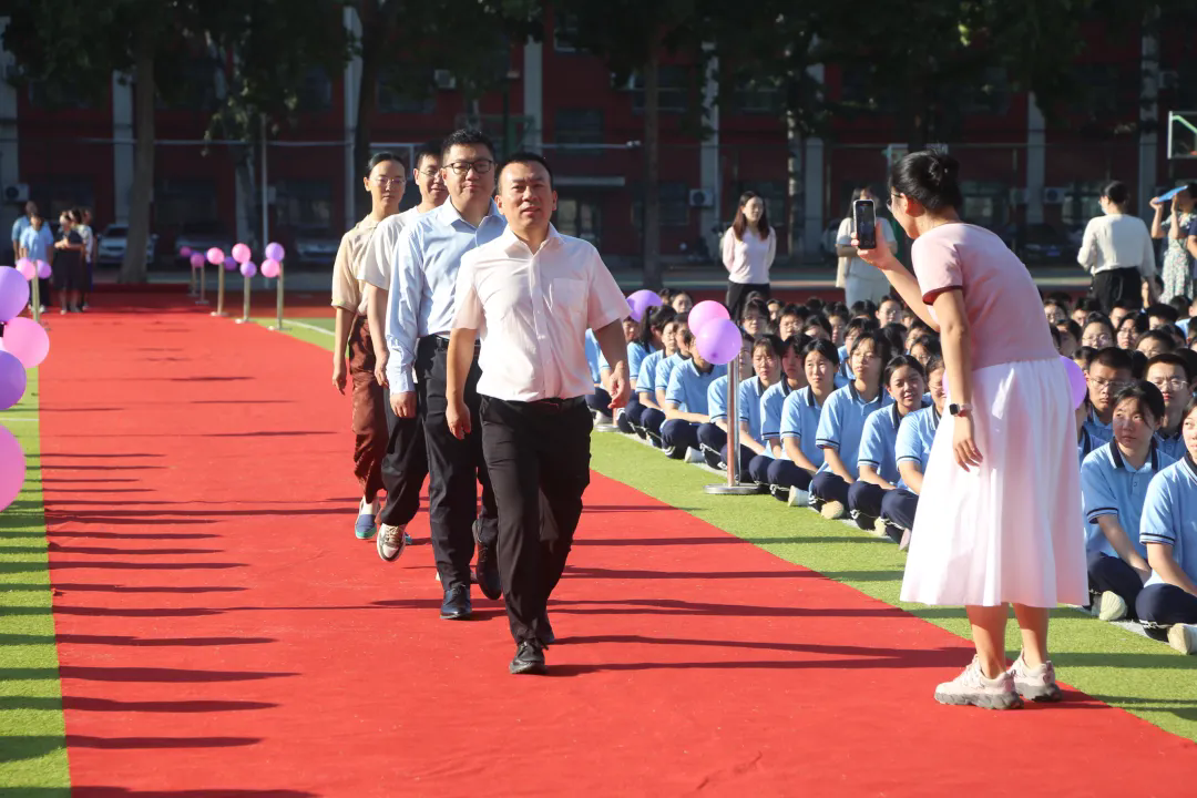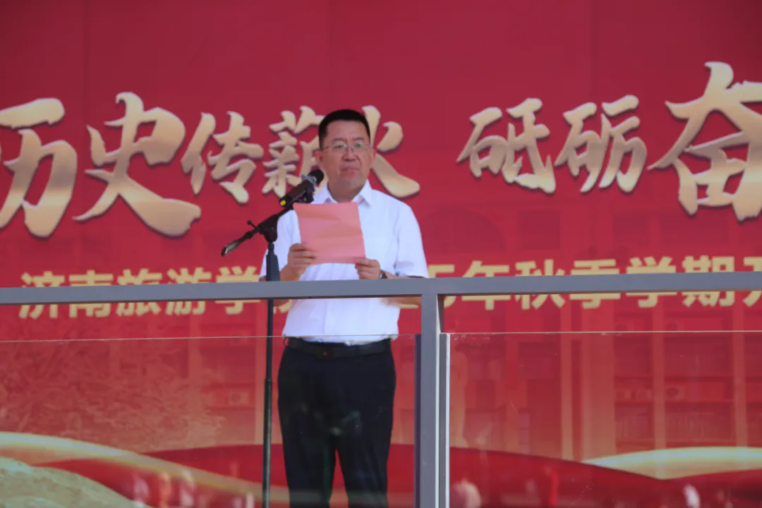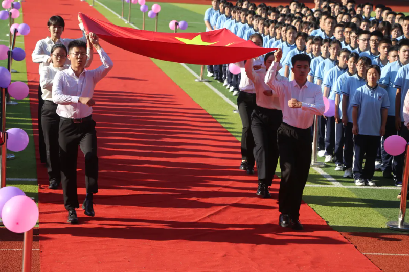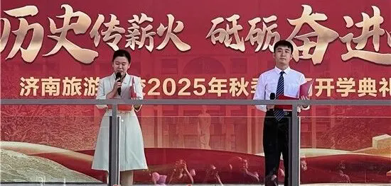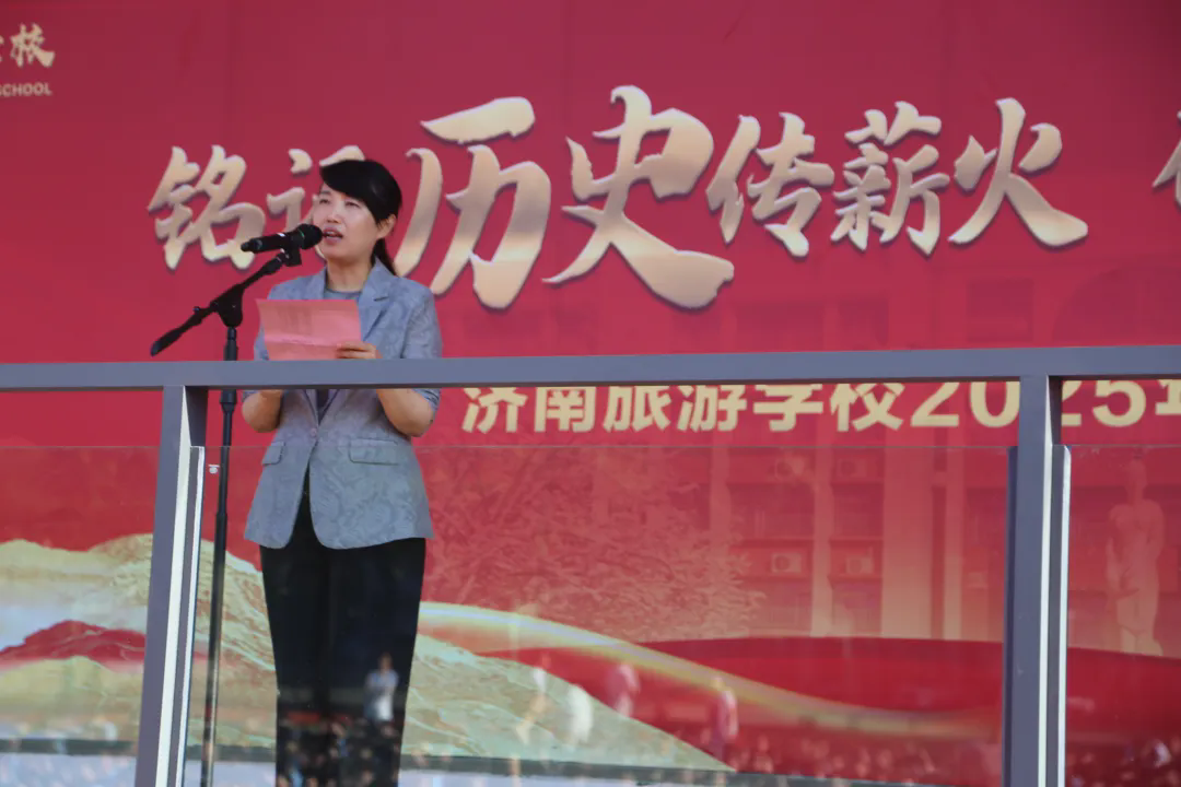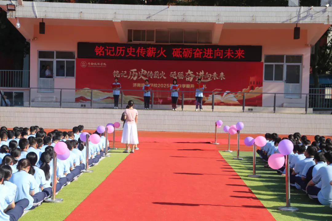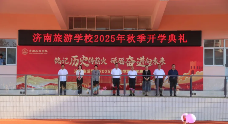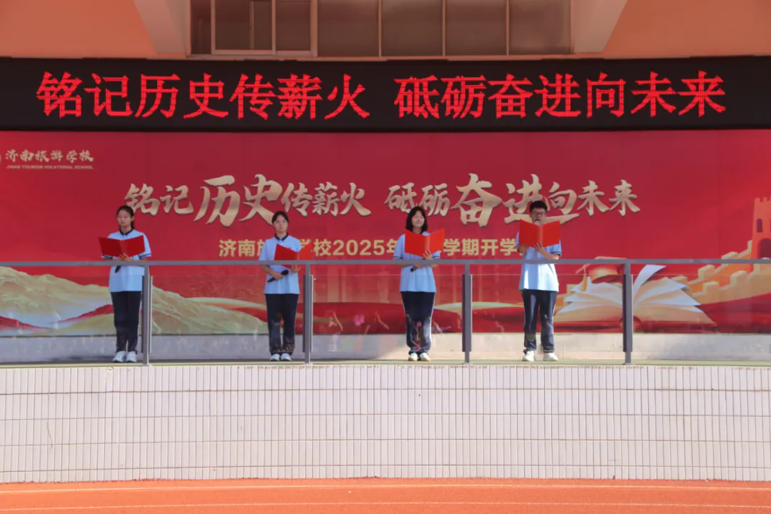 9月1日,济南旅游学校在两校区运动场同步举行2025年秋季开学典礼,主题为“铭记历史 强国有我 初心如磐 逐梦未来”。活动共分三个篇章,全体师生参加,部分家长代表现场观礼。 第一篇章 铭记历史·初心如磐 首先进行的是升国旗仪式。全体师生肃立在运动场上,迎接国旗入场,国旗护卫队由新教师代表组成,他们迈着整齐的步伐,正步护卫国旗入场。全体师生行注目礼,高唱国歌,向国旗致敬。 在庄严的升旗仪式后,学校领导为获得省级、市级优秀班集体,校级优秀班集体、红旗团支部的班级师生代表颁奖,并进行了济南旅游学校群星闪耀表彰、假期实践活动优秀团体表彰等。
