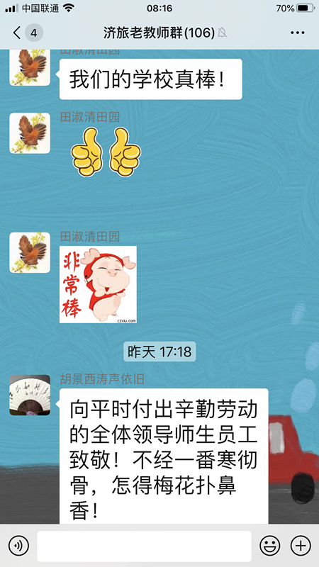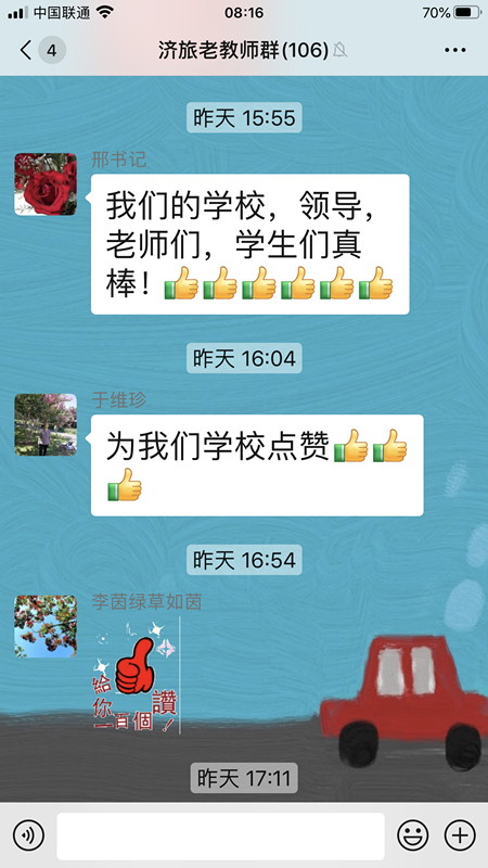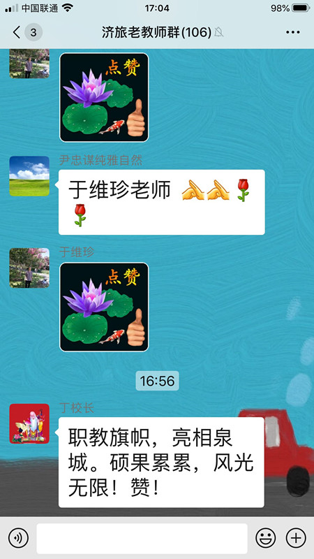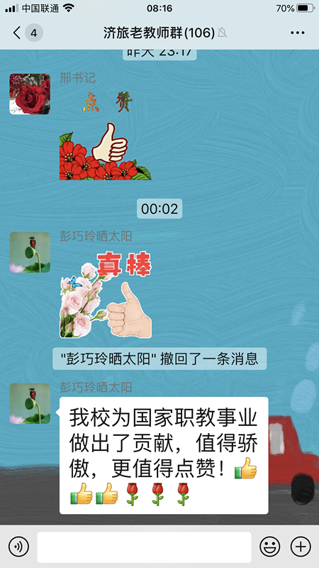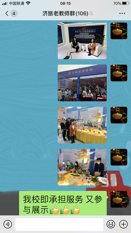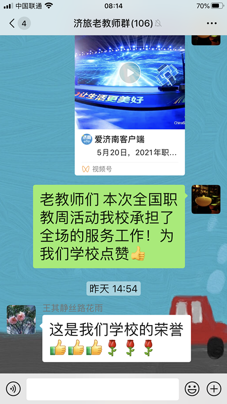 济南旅游学校在职教周展示活动中,认真做好各项宣传工作,通过各种方式将职教周的盛况、职教周学校的展示作品、市教育局及学校关于职教周的宣传材料及时推送给家长和离退休教师,引起强烈反响,特别是学校离退休老教师,更是纷纷为济南职业教育和学校发展点赞。