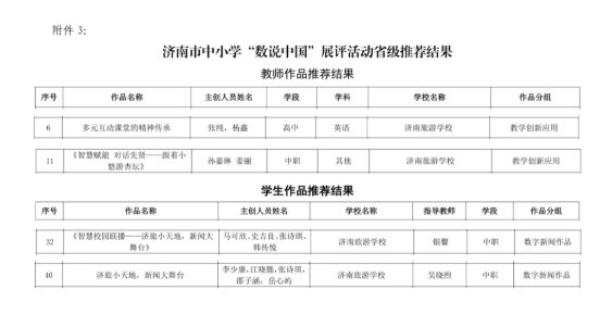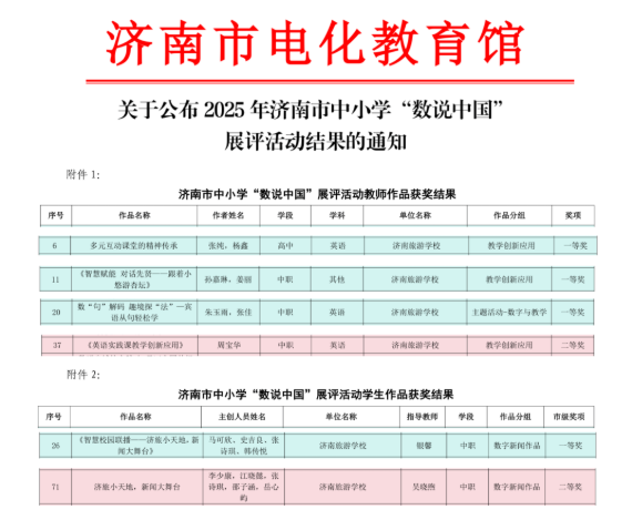 近日,2025年济南市中小学“数说中国”展评活动正式公布结果。济南市电化教育馆组织专家对我市参加展评活动的作品进行了评审,共评选出教师作品一等奖32件,二等奖42件,三等奖21件,评选出学生作品一等奖39件,二等奖53件,三等奖26件。济南旅游学校师生在评比中取得优异成绩,荣获教师组作品一等奖3个、二等奖1个,学生组作品一等奖1个、二等奖1个。